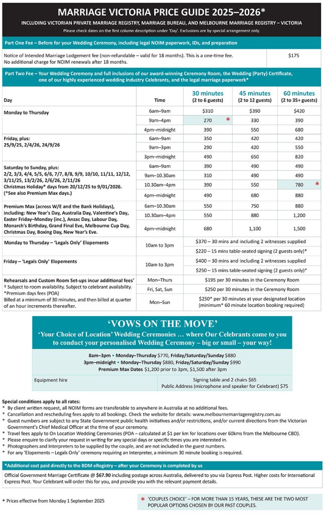 Please note – after the celebrant uploads all the legal documentation into the Government marriage portal, the final processed Marriage Certificate will be obtainable from www.bdm.vic.gov.au for the current fee of $64.40 with local Express Post delivery including. Please check their website for details.